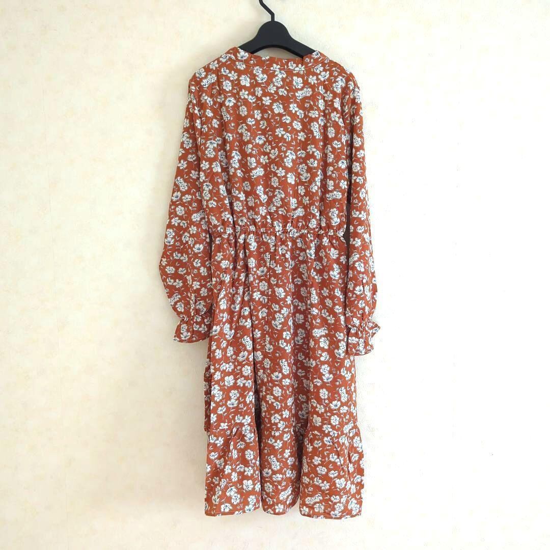 ワンピース レンガ オレンジ L サイズ 長袖 秋 冬 膝 ひざ 丈 花 柄