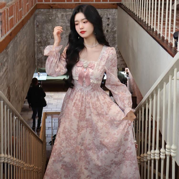 ワンピース ピンク 甘め S サイズ ガーリー 長袖 リボン 花 柄 ロリータ お姫 様 М