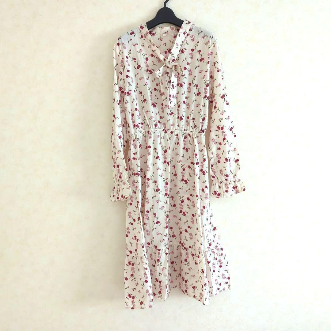 花 柄 ワンピース 白 ホワイト L サイズ 秋 冬 エレガント A a ライン 長袖 胸元 リボン りぼん